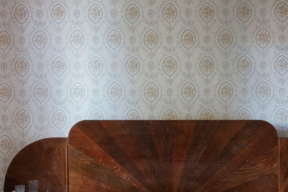 Schlafzimmer mit Retro-Tapete in der 1. Etage einer alten Villa.