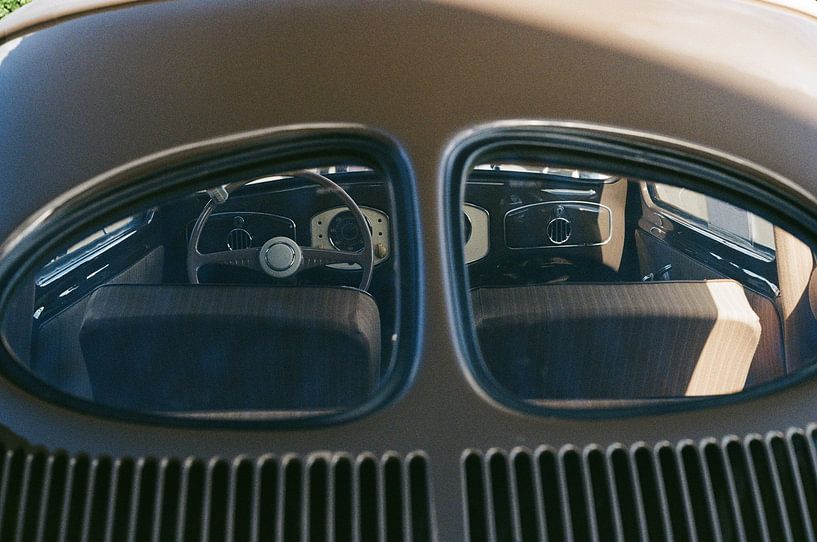 Dieses faszinierende Foto bietet einen seltenen Blickfang für Liebhaber historischer Automobile. Durch die charakteristische geteilte Heckscheibe – das legendäre „Brezel-Fenster“ – blickt man direkt in das Herz eines frühen Volkswagen Käfers. Aufgenommen auf echtem Analogfilm, strahlt das Bild eine Wärme und Authentizität aus, die…