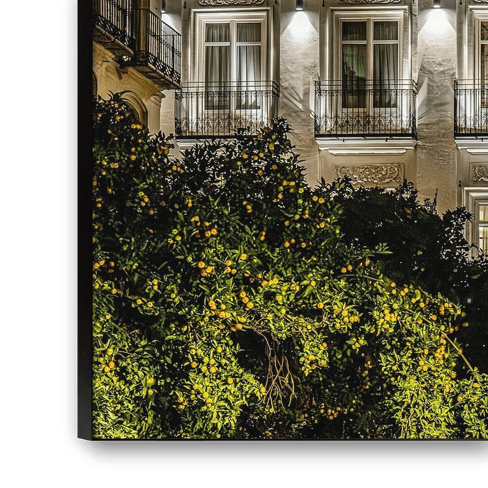 Foto Jugendstil Gebäude mit Beleuchtung und Orangenbaum in Altstadt von Valencia Spanien bei Nacht