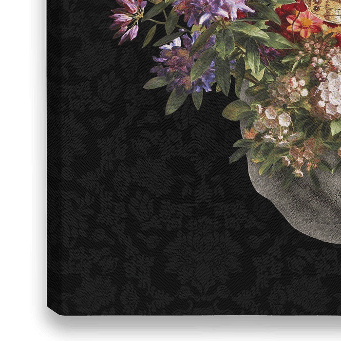 Ein Vanitas-Stillleben mit menschlichem Schädel, einem Blumenstrauß und einem Schmetterling.