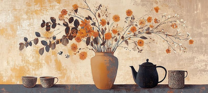 Vase mit Blumen – Dieses Blumenbild ist ein Japandi-Stillleben mit einer großen Tonvase voller loser orangefarbener Blumen und fein verzweigten Blättern als zentralem Element, neben einer dunklen Teekanne und verzierten Tassen auf einem schlichten Tisch. Dieses Blumenbild / Blumenmalerei verwendet warme Beige- und Terrakottatöne mit…