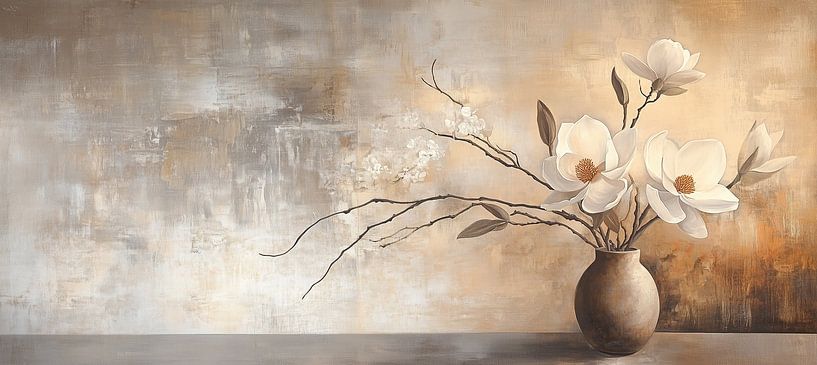 Soft White Magnolia Vase – Dieses Blumenbild ist ein modernes Japandi-Stillleben mit drei großen, magnolienartigen weißen Blüten und anmutigen Zweigen in einer runden Keramikvase, gemalt in sanften, neutralen Texturen und warmen Erdtönen – ein ruhiges Blumenbild, das in einem modernen Interieur sofort ins Auge fällt.