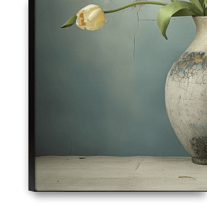 Bestelle dieses Blumen-Wandbild Vase mit Tulpen im Wabi-Sabi-Stil von Studio Allee als Reproduktion auf Leinwand, Alu-Dibond, als Poster, Fototapete oder Acrylglasbild.