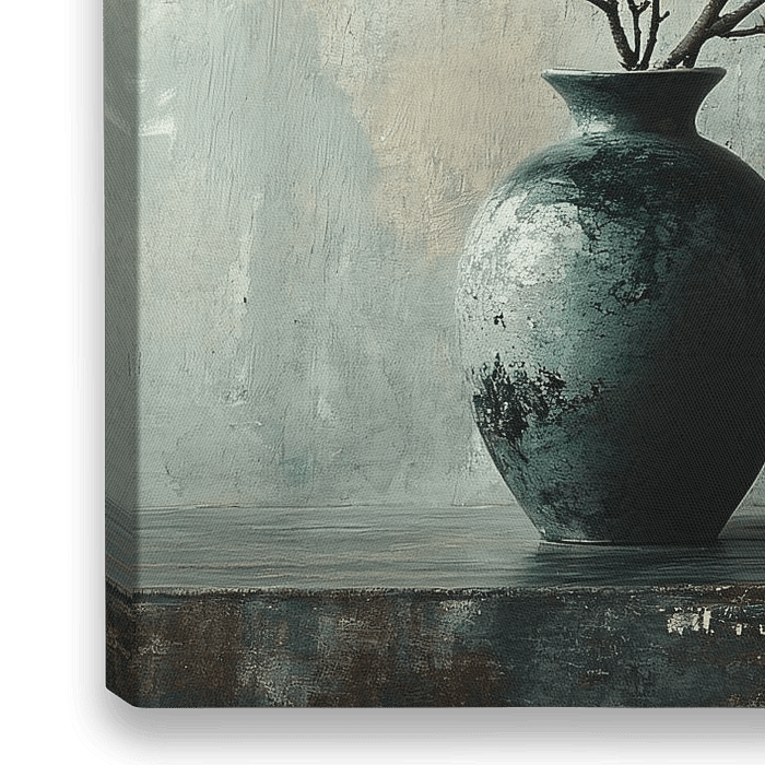 Dieses heitere Kunstwerk strahlt Schlichtheit und natürliche Schönheit aus. Es zeigt eine raffinierte, rustikale Vase, gefüllt mit zarten weißen Blütenzweigen vor einem verwitterten blau-grünen Hintergrund. Die sanften Farben und subtilen Details machen es zu einer perfekten Ergänzung für eine ruhige und minimalistische Wohnumgebung.…