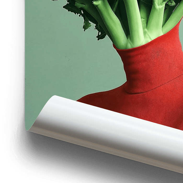 Dieses Kunstwerk spielt mit der Idee, wie die Inhaltsstoffe von Brokkoli uns nicht nur innerlich, sondern auch äußerlich schöner machen können – dargestellt auf ironische, aber charmante Weise.