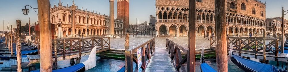 Panorama am Markusplatz von Venedig mit blauen Gondeln.