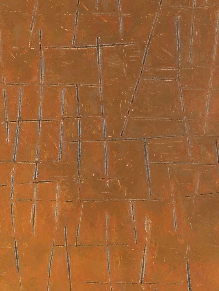 Der Hintergrund trägt einen warmen, kupferfarbenen Ton. Tiefe entsteht nicht durch Farbverläufe, sondern durch Wiederholungen und Brüche. Die Linien wirken wie geätzt, eher gezeichnet als gemalt.