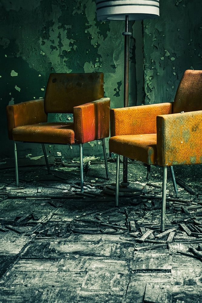 In einem düsteren Raum stehen zwei orangefarbene Sessel, verlassen und von der Zeit gezeichnet. Ihre einst lebendigen Farben wirken nun matt und schmutzig, Zeugen von Jahren der Vernachlässigung und des langsamen Verfalls. Der Boden ist mit brüchigen Holz und Staubresten bedeckt, als ob die Vergangenheit hier ihre Spuren hinterlassen hätte. Die Wände, von abblätternder Farbe und Rissen überzogen, erzählen Geschichten von Verlassenheit und Vergessen. In der Ecke des Raumes steht eine einsame Stehlampe, die möglicherweise einst den Raum erhellte, nun jedoch selbst in Dunkelheit gehüllt ist.