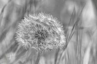 Der wunderschöne, flauschige Blütenkopf eines Löwenzahns. In Schwarz-Weiß umgewandelt, um die zarten Flocken besser zur Geltung zu bringen. Durch die geringe Schärfentiefe bilden die Grashalme einen schönen unscharfen Hintergrund.
