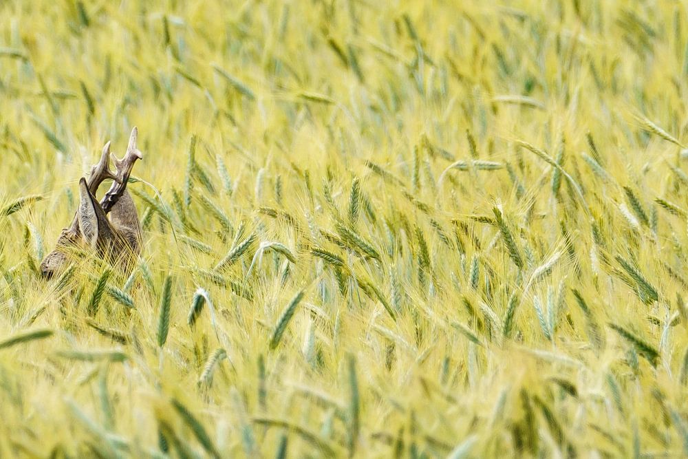 Ein Rehgeiß-Bock, fast vollständig verschwunden im Gold der Monokultur. Dieses Bild, aufgenommen in der Wiener Agrarlandschaft, ist ein Symbol für den unsichtbaren Überlebenskampf unserer Wildtiere. In einer Welt der exzessiven Landwirtschaft werden die Äcker zum einzigen, fragilen Zufluchtsort. Ein minimalistisches Werk, das erst auf…