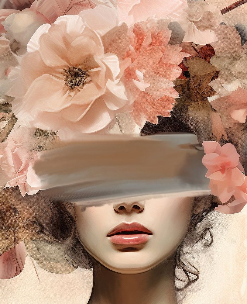 Porträt einer schönen Frau mit schönen Blumen im Haar in Schattierungen von rosa, braun und grau. Natürlich und pastellfarben. Raffiniert und erhaben. Rein und in Unschuld gehüllt. Passend zu verschiedenen Stilen und Trends.