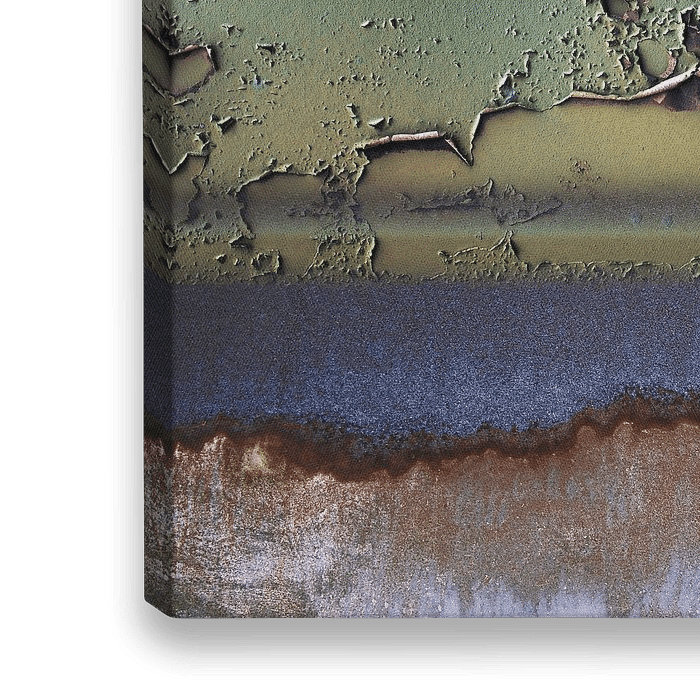 Abstrakte Kunst mit Metall, Stein und abblätternder Farbe in Grün- und Blautönen