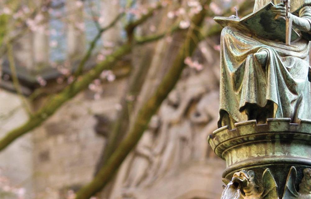 Der Autor des Tribunalbuchs der Domkirche in Utrecht, Hugo Wstinc, steht auf dem Brunnen im Hof des Doms in Utrecht.