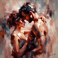 Ein Mann und eine Frau sind in einer engen Umarmung abgebildet, ihre Gesichter berühren sich fast in einem Moment der Intimität. Das Kunstwerk zeichnet sich durch lebendige Pinselstriche und eine warme Farbpalette aus, die ein Gefühl von Leidenschaft und Bewegung hervorrufen.