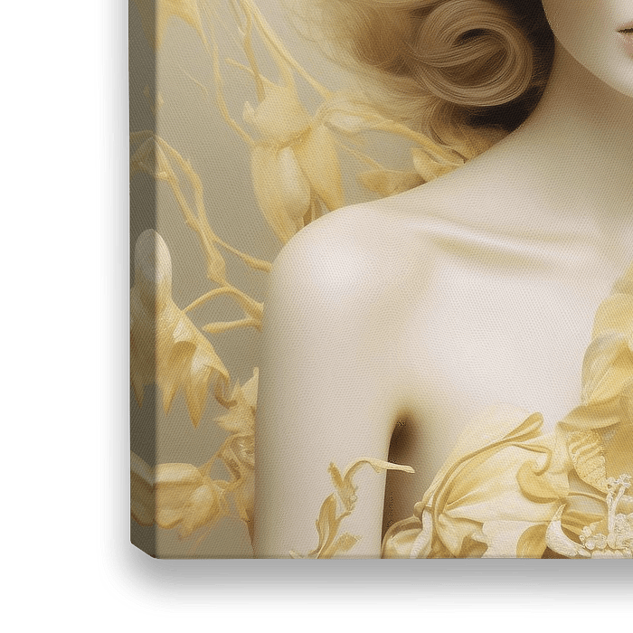 Fantasievolles Porträt eines verträumten Mädchens mit goldgelben Orchideen.