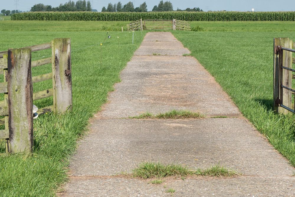 Via betonnen paden kunnen zware landbouwvoertuigen door de weilanden rijden. Polderlandschap achter Bleskensgraaf in de Alblasserwaard.