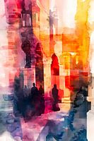 Sich in einer alten Stadt verlieren, ist ein Zusammenspiel warmer Farben, die mit einer Aquarelltechnik zusammenkommen. Das Bild zeigt eine alte Stadt in der Abendsonne im Sommer. In der Straße sieht man Silhouetten und Schatten von Menschen.