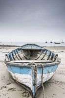 Das Bild zeigt ein verlassene, blaue Boot am Strand, das von sanften Sanddünen umgeben ist. Die verwitterte Holzstruktur und die abblätternde Farbe erzählen Geschichten vergangener Fahrten. Im Hintergrund sind weitere Boote zu sehen, die in der nebligen Küstenlandschaft schaukeln, während der graue Himmel eine melancholische Stimmung…