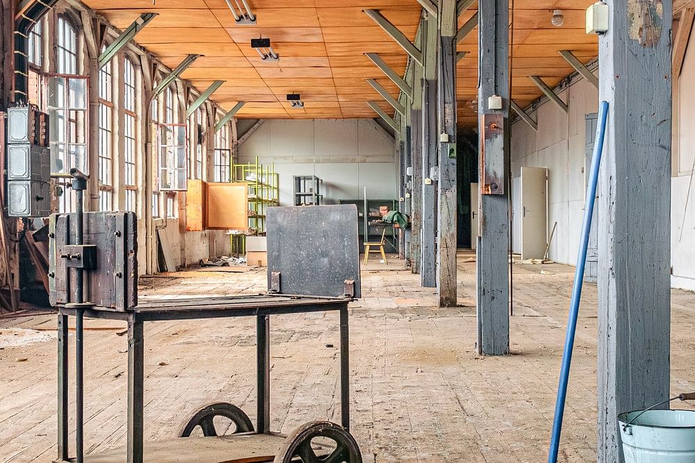 Diese riesige Fabrikhalle ist ein beeindruckendes Relikt aus einer vergangenen Zeit. Das Licht strömt durch die hohen, staubigen Fenster und wirft lange Schatten auf den abgenutzten Holzboden, der vom Lauf der Zeit gezeichnet ist. Ein alter Metallwagen mit rostigen Rädern steht im Vordergrund, als hätte ihn jemand vor Jahrzehnten dort abgestellt und wäre nie zurückgekehrt. Ein vergessener Besen und ein Eimer deuten auf eine unterbrochene Aufräumaktion hin, doch die Zeit scheint seither stehen geblieben zu sein. Die Wände weisen Abnutzungserscheinungen auf, und die wenigen verbliebenen Regale deuten auf die Industrie hin, die hier einst florierte. Diese Halle erzählt von Arbeit und Maschinen, vom ständigen Brummen der Arbeit, das nun durch absolute Stille ersetzt wurde.