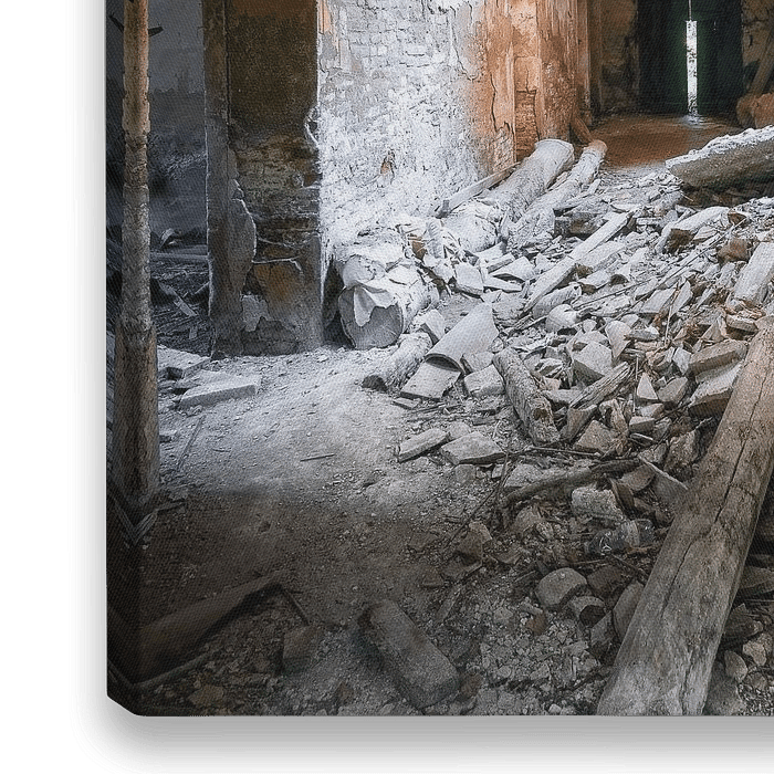 Dies ist ein Bild, das ich in einer schönen, verlassenen Villa aufgenommen habe, die sich eindeutig in ernsthaftem Verfall befindet. Ein großer Teil des Gebäudes ist eingestürzt oder steht kurz vor dem Einsturz. Zwischen den schweren Verfallserscheinungen sieht man Zeichen der schönen Kunst, die einst die Wände und Decken bedeckte.