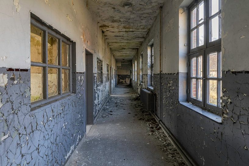 Verlassener Flur mit abblätternder Farbe an den Wänden und an der Decke.