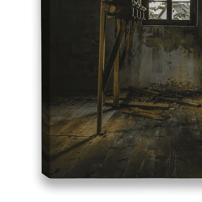 Dieses Bild zeigt einen verlassenen Raum mit einer eindrucksvollen Mischung aus alten Maschinen und verfallener Architektur. Ein einzelnes Fenster lässt nur wenig Tageslicht in den dunklen Raum, wodurch die Schatten der großen, industriellen Gerätschaften auf den Boden und die Wände fallen. Die hölzernen Strukturen und metallenen…