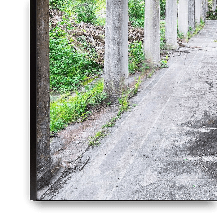 Dies ist ein Foto eines schönen, verlassenen und baufälligen Korridors, der Teil eines Bahnhofs ist und vollständig von der Natur übernommen wurde.