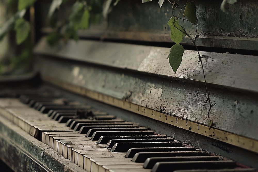 Dieses schöne Design zeigt ein verlassenes Klavier, das langsam von der Natur erobert wird. Die Tasten sind mit einer Staubschicht bedeckt und das verwitterte Holzgehäuse verleiht dem Ganzen ein nostalgisches Gefühl. An den Seiten des Instruments wachsen Kletterpflanzen, die die Vergänglichkeit von Zeit und Schönheit zeigen. Die Kombination aus dem Alter des Klaviers und dem Grün der Pflanzen schafft eine Atmosphäre der Ruhe und Verlassenheit. Dieses Bild ist ideal für Liebhaber von Vintage-Dekor und Menschen, die sich an der Romantik vergangener Glanzzeiten erfreuen. Es ist eine einzigartige Ergänzung für jeden Raum, in dem es eine Geschichte über vergangene Tage und natürliche Schönheit erzählt.