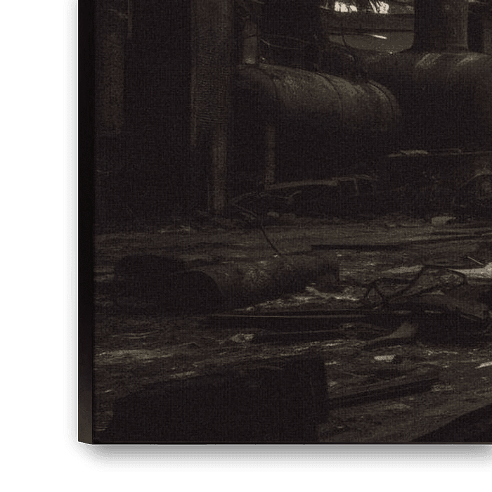Die Farbpalette des Bildes spiegelt die düstere Stimmung der Szene wider. Gedämpfte Grautöne, verblasstes Gelb und verwittertes Braun dominieren den Raum und rufen ein Gefühl der Nostalgie für eine vergangene Ära hervor. Die abblätternde Farbe und die freiliegenden Metalloberflächen tragen die Spuren der Zeit und der Vernachlässigung und tragen zur rauen Schönheit der verfallenen Industrieumgebung bei.