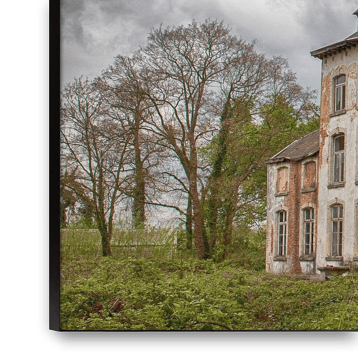 Verlassenes Schloss in Belgien vor einem dunklen Himmel mit schwarzen Wolken. Im Vordergrund Sträucher und Gras. Die Fenster sind kaputt.