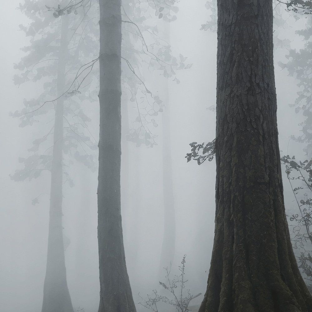 Dieses Gemälde fängt die mystische Atmosphäre eines dichten, nebligen Waldes ein, in dem ein einsamer Wanderer seinen Weg geht. Die hohen Bäume heben sich vom grauen Dunst ab und erwecken ein Gefühl der Unendlichkeit und der Introspektion. Die Ruhe und das Geheimnis des Waldes laden zu einer inneren Reise durch die Stille der Natur ein.