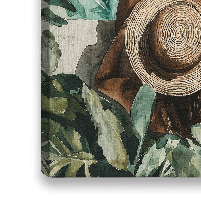 Ein stimmungsvolles Gemälde, das einen rustikalen Moment mit Strohhut und offenem Buch vor einem Hintergrund aus üppigen Monstera-Blättern und einem türkisfarbenen Swimmingpool einfängt. Die Komposition strahlt eine ruhige, tropische Atmosphäre aus und lädt zum Entspannen und literarischen Nachdenken ein.