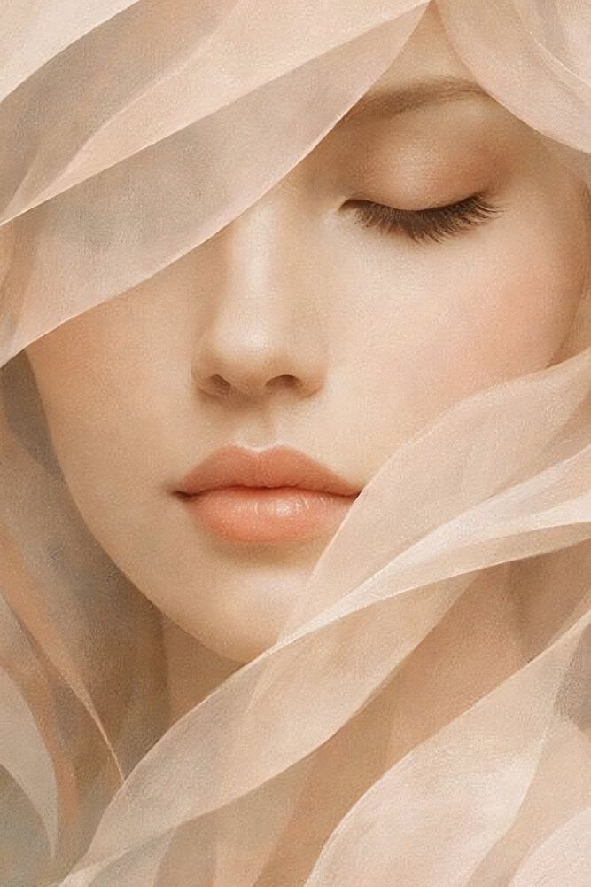 Dieses Kunstwerk zeigt ein sanft verhülltes Frauenporträt, bei dem fließende, durchscheinende Schichten das Gesicht teilweise einrahmen und verdecken und so ein Gefühl von ruhigem Geheimnis und emotionaler Tiefe vermitteln. Die sanfte Bewegung der stoffähnlichen Texturen verleiht dem Bild Rhythmus und Weichheit, während die…