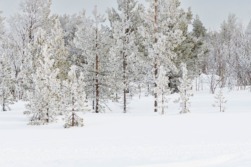 Verschneite Landschaft in Schwedisch-Lappland an einem nebligen Tag im März. Die Zweige der Bäume sind noch mit Frost bedeckt und daher komplett weiß. Es war eine magische Reise ins schöne Lappland!