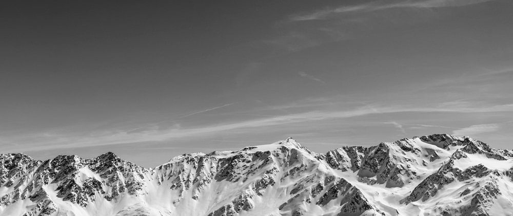 Blick auf die verschneiten Tiroler Alpen in Österreich an einem schönen Wintertag. Von den Skipisten des Skigebiets Sölden in der Nähe des Ötztals werden die Berge gesehen. Schwarz-Weiß-Bild.