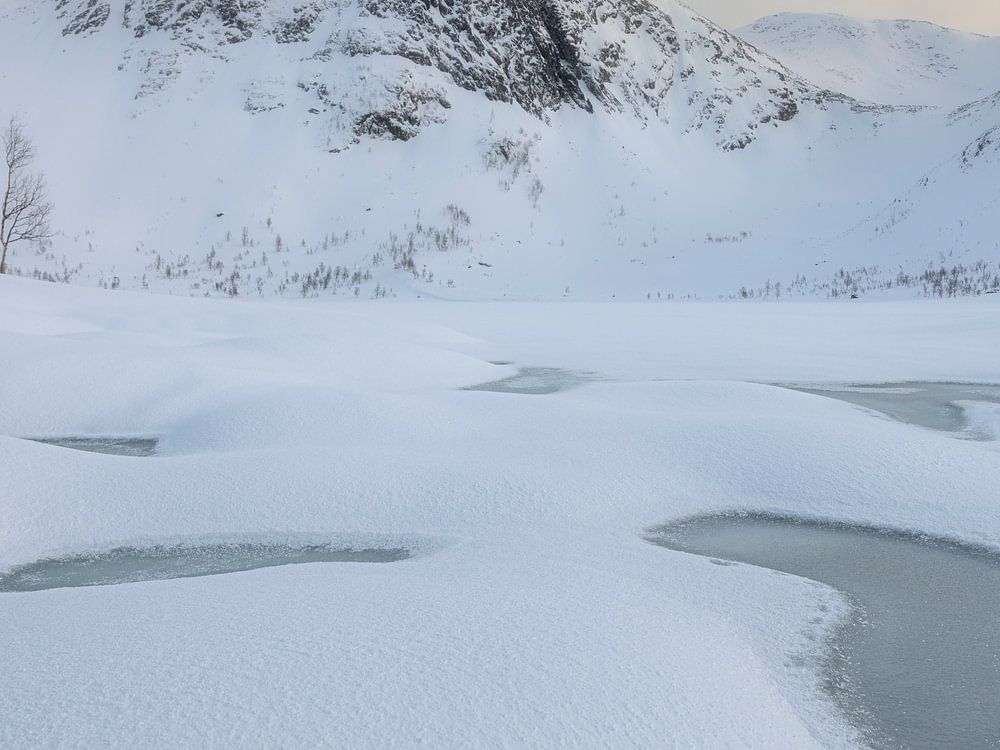 Ein zugefrorener See mit Neuschnee auf der Insel Senja in Norwegen. Das Foto wurde an einem schönen Wintermorgen kurz nach Sonnenaufgang aufgenommen.