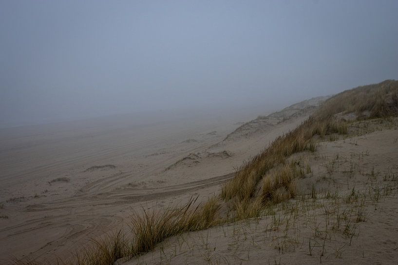 Eine stille Strandszene, in der Meer, Himmel und Land langsam miteinander verschmelzen. Sanfte Dünen mit wogendem Strandhafer lenken den Blick auf einen Horizont, der von dichtem Nebel verschluckt wird. Die Spuren im Sand verraten menschliche Anwesenheit, aber Leere und Stille überwiegen. Dieses Foto fängt einen Moment der Ruhe, des…