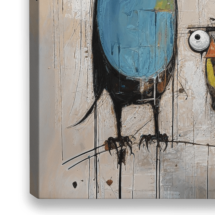 Playful Birds - Dieses charmante Kunstwerk besticht durch ein Quartett stilisierter Vögel, die in einer verspielten Farbpalette aus Blau-, Orange- und Neutraltönen gehalten sind. Die abstrakte, fast cartoonartige Darstellung erinnert an eine moderne Interpretation von Vogelszenen, mit einem subtilen Humor, der jedem Interieur sofort…