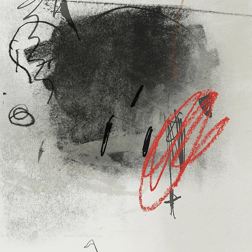 Ein Meisterwerk der Konzeptkunst und zeitgenössischen Abstraktion, das vor Humor und Metaphern nur so strotzt. In der Mitte verschränkt sich eine dichte, atmosphärische, kohleschwarze Masse mit einem lebhaften, hüpfenden roten Kreidestrich, der die dynamische Spannung zwischen "Verstecken" und "Suchen" symbolisiert.…