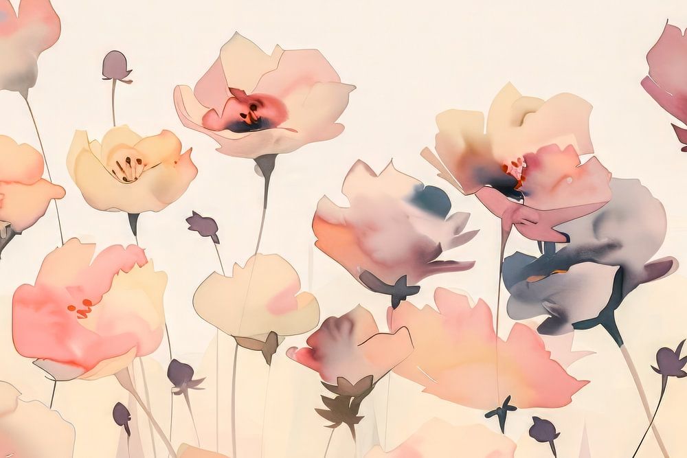 In diesen abstrakten Blumenarrangements werden die subtilen Farben und die zarte Textur von Aquarellfarben auf einem beigen Hintergrund zum Leben erweckt. Die Blumen sind mit einer tiefen, ruhigen Stille dargestellt, als ob sie aus einem alten, vergilbten Album stammen. Die Details sind zurückhaltend, aber der Ausdruck ist kraftvoll. Das Ergebnis ist ein Werk, das uns zum Nachdenken über die Einfachheit und Schönheit der Natur anregt.