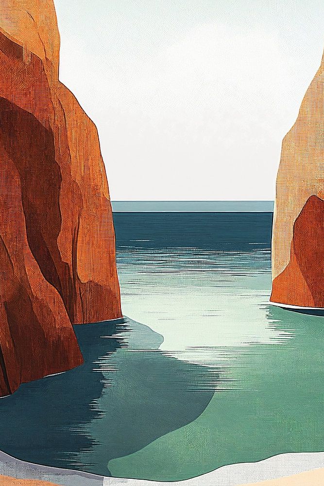 Eine ruhige digitale Illustration einer versteckten Bucht, in der imposante orangefarbene Klippen das türkisfarbene Meer umarmen. Der warme Sandstrand ist mit robusten Felsbrocken und dezenter Palmenvegetation geschmückt, während das ruhige Wasser und der helle Himmel einen perfekten Kontrast zu den majestätischen Felsformationen bilden.