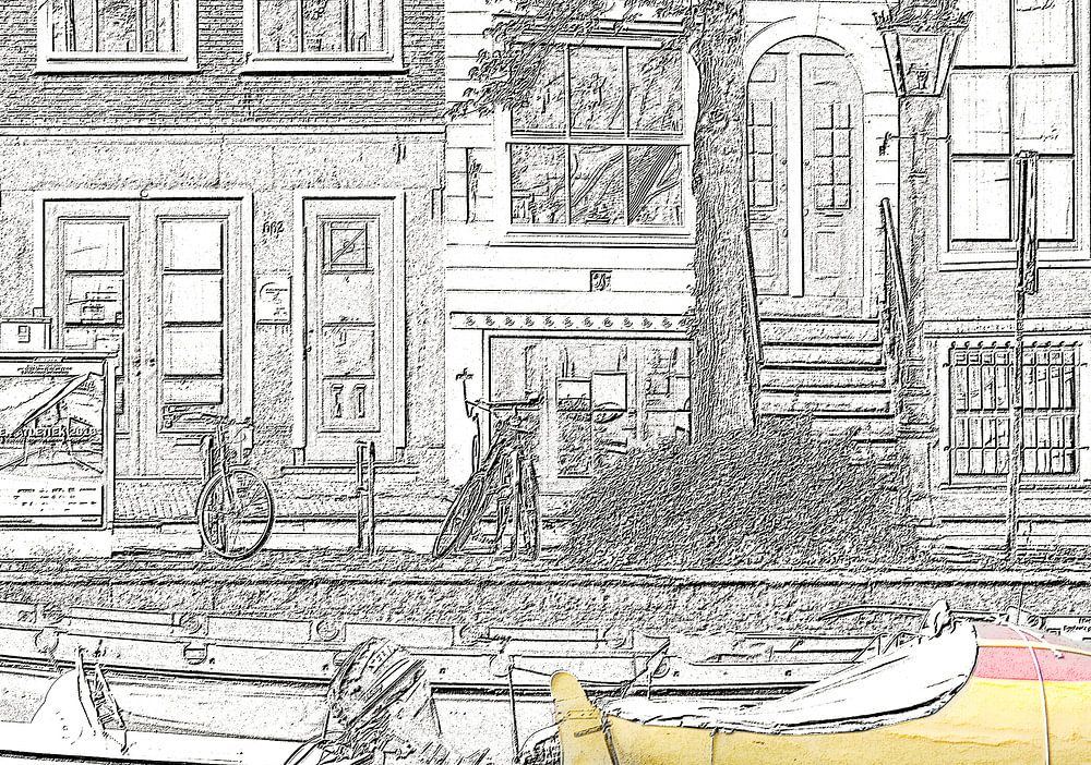 Wie niederländisch wollen Sie die Amsterdamer Kanäle und ein Segelschiff in Form eines Holzklotzes, das komplett im Stil einer alten Postkarte gestaltet ist.
