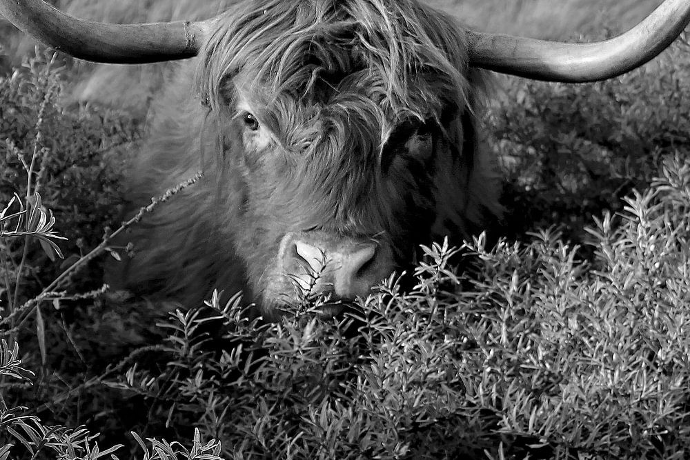 Deze zwangere Schotse hooglander bleef wat achter bij de groep die al verder de duinen in waren... in zwart wit.
