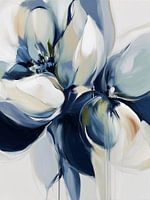 Nahaufnahme einer Blume in einem verträumten, fast fließenden Stil. Sanfte Blau- und Weißtöne sowie dezente Beige-Akzente gehen fließend ineinander über, wodurch die Form der Blütenblätter nur teilweise abgegrenzt wird. Die Pinselstriche sind locker und ausdrucksstark, wobei die Farbe an manchen Stellen zu tropfen scheint, was ein…