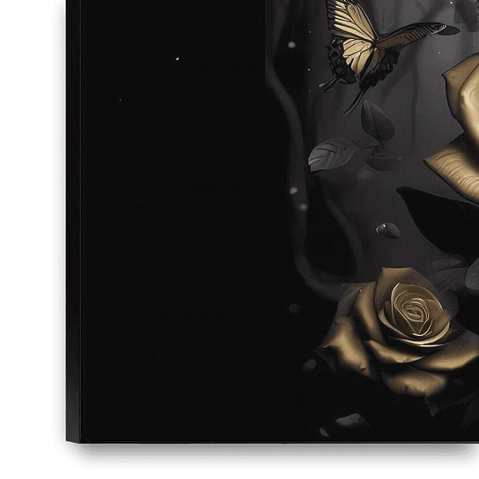 Dieses bezaubernde Kunstbild zeigt eine elegante Elfe, deren zarte Flügel schimmernd in Schwarz und Gold erstrahlen. Umgeben von einer romantischen Kulisse aus goldenen Rosen, strahlt sie Anmut und Mystik aus. Die feinen Details der Rosenblätter und der filigranen Flügel verleihen dem Bild eine träumerische Atmosphäre. Die Kombination…