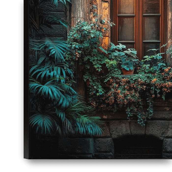 Bestelle das digitale Kunst Bild Verziertes Rundbogenfenster mit Efeu und warmem Licht von Matthias Hauser als Reproduktion auf Leinwand, Alu-Dibond, als Poster, Fototapete oder Acrylglasbild.