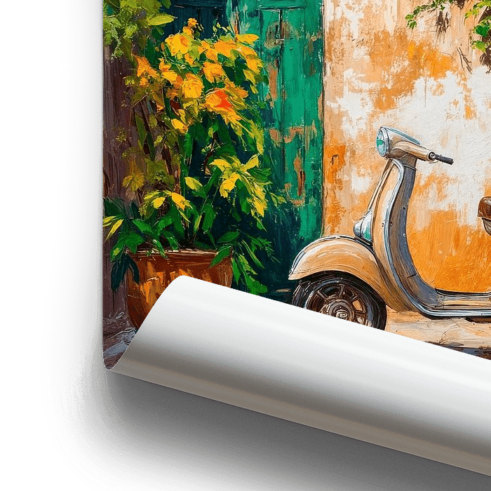 Ein charmanter Augenblick italienischer Lebensfreude, eingefangen in sanften Erdtönen. Die schlichten, grünen Fensterläden öffnen den Blick auf üppige Blumen, während ein nostalgischer Roller entspannt im Vordergrund steht. Zarte Sonnenstrahlen umarmen die wandverzierte Fassade und verleihen diesem idyllischen Ort einen Hauch von…