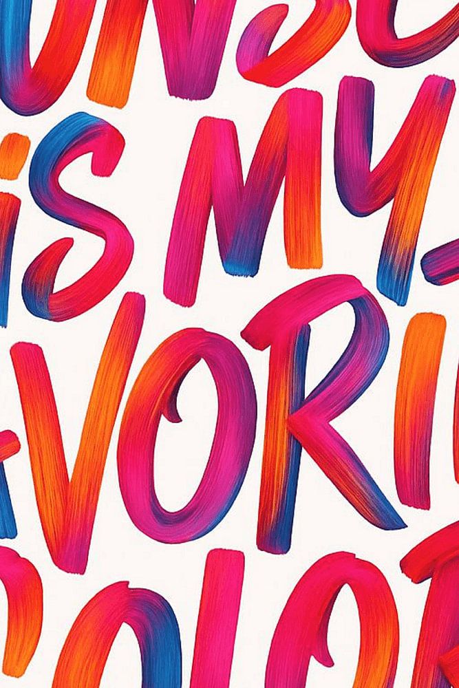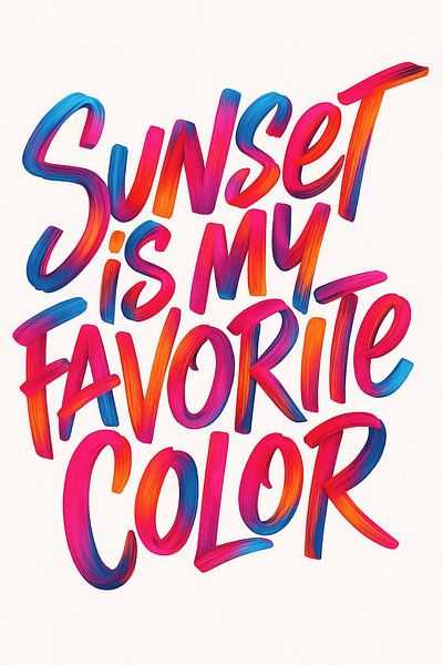 Bestelle diese Malerei Vibrant Hand-Lettered "Sonnenuntergang ist meine Lieblingsfarbe" Pinselstrich Typografie Kunstdruck, Farbverlauf bunte Wanddekoration für Wohnzimmer und Schlafzimmer von Artistic als Reproduktion auf Leinwand, Alu-Dibond, als Poster, Fototapete oder Acrylglasbild.