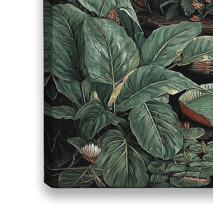Inmitten eines tropischen Regenwalds gleiten riesige Seerosenblätter lautlos über die Wasseroberfläche, als würde die Zeit stillstehen. In der Mitte des Flusses öffnen sich zarte weiße Blüten, umgeben von tiefgrünem Blattwerk und orangefarbenen Dschungelblumen. Ein feiner Nebel zieht sich durch die Palmenstämme und führt den Blick zu…