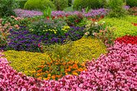 Formatfüllendes Bild eines Gartens mit vielen bunten blühenden Blumen zur Sommerzeit